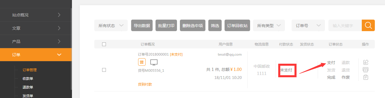 当订单状态是未支付时(客户无法使用网站提供的在线支付接口付款时,通过线下转帐、现金支付等方式收到的款)管理员在订单中点击支付后录入收款信息会生成收款单